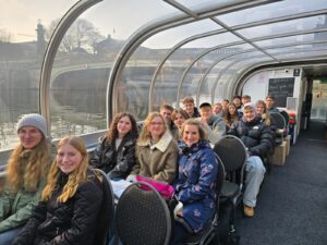 Lange war gar nicht klar, ob die Berlinfahrt des Politik-Leistungsfachs überhaupt stattfinden konnte, da es nach der Buchung keine Regierung mehr gab. Doch zum Glück konnten die sehr interessierten Schülerinnen und Schüler* doch noch ihre politische Fahrt antreten, um sich bei der Mauer-Gedenkstätte Bernauer Straße, im Stasi-Gefängnis Hohenschönhausen oder auch bei der Führung im Museum zur „Topographie des Terrors“ zu informieren und weiterzubilden. Ein Höhepunkt war sicherlich der Besuch des Reichstags mit der spannenden Fragerunde bei MdB Andrea Lindholz, die sich für die vielen Fragen der HSGler zwischen den Koalitionsverhandlungen Zeit nahm. Auf den Fotos ist die Gruppe bei einer Spreerundfahrt mit OStRin Meyerhuber zu sehen bzw. beim obligatorischen Gruppenfoto vor dem Brandenburger Tor mit OStR Asmus.