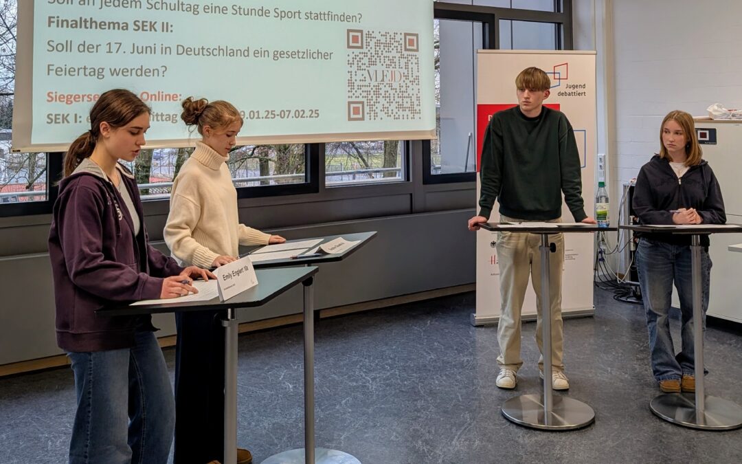Wir gratulieren unseren Siegerinnen der SEK I, Emily Englert (10a) und Sophie Slowik (9c), die über die Möglichkeit einer zusätzlichen täglichen Sportstunde debattierten sowie den Gewinnerinnen der SEK II, Melina Uhl (11c) und Nele Hartmann (Q12), die das schwierige Thema eines Feiertags zum Gedenken an den 17.06.1953 klärten.